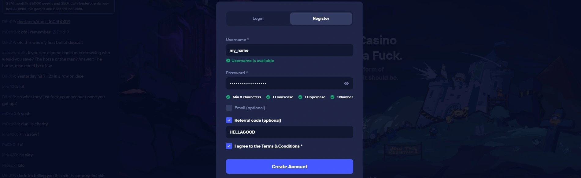 Existing players can’t use or redeem the Duel Casino bonus code. Be aware of the fact that the code can only be redeemed while signing up for an account on the website. After completing the registration form, click on the “Referral Code (optional)” text and type in the promo code you received to trigger the offer.